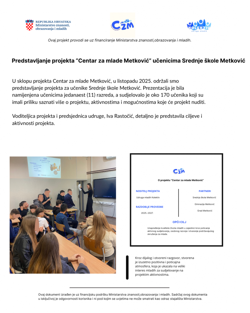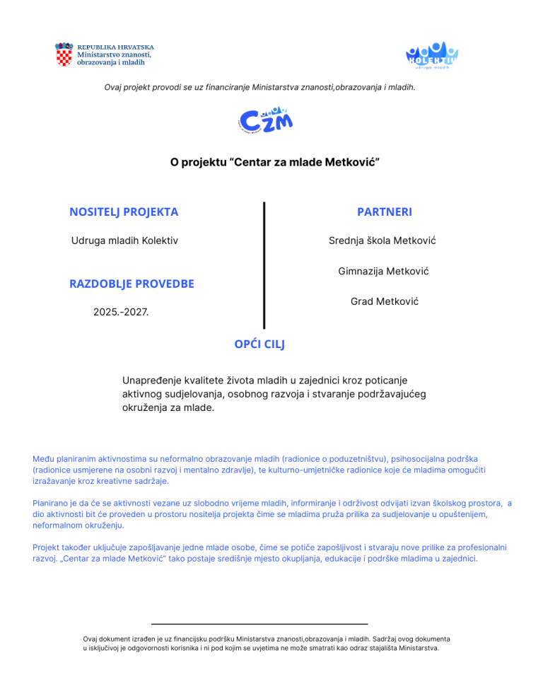 Dobrodošli na web stranicu projekta „Centar za mlade Metković”